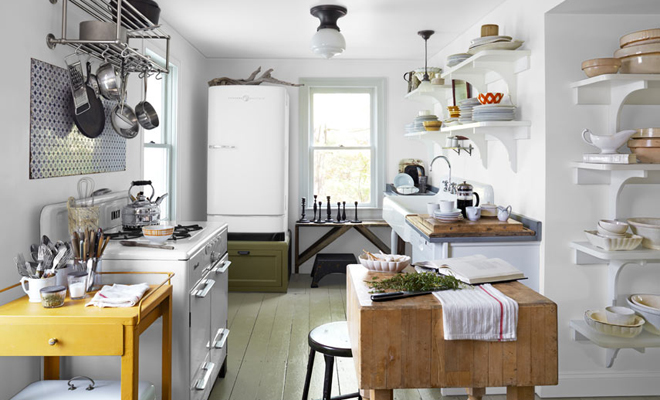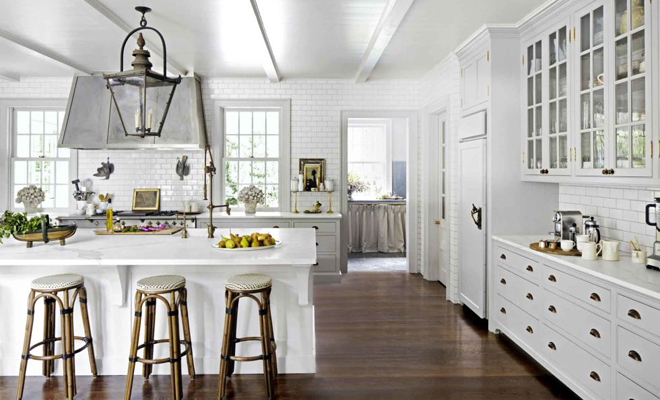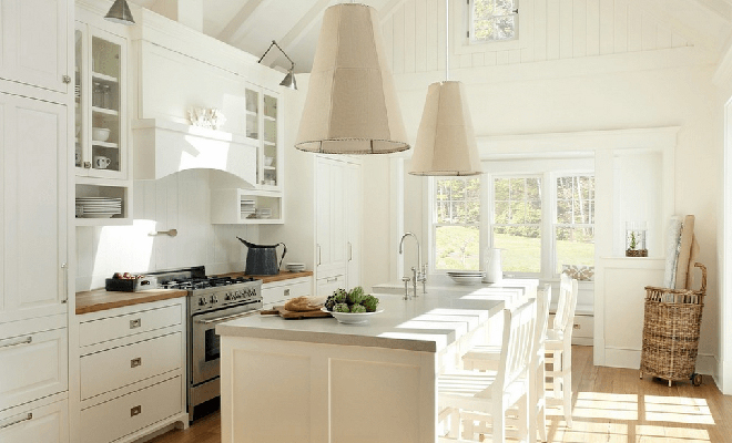 Beyaz renk country tarzı mutfaklar için de kullanılabilir. Bu dekorasyonu porselen mutfak aksesuarlarıyla tamamlayabilirsiniz. Böyle bir mutfakta çiçek desenli perde ve masa örtüsü de kullanışlı olacaktır.