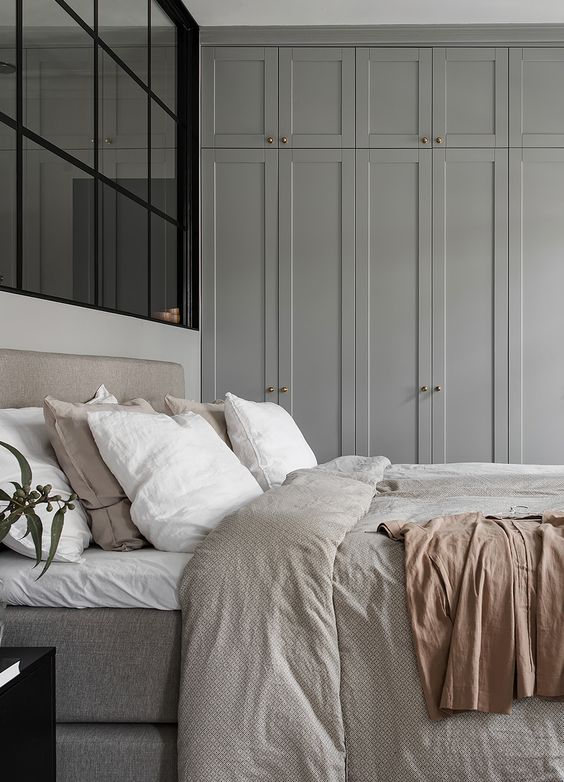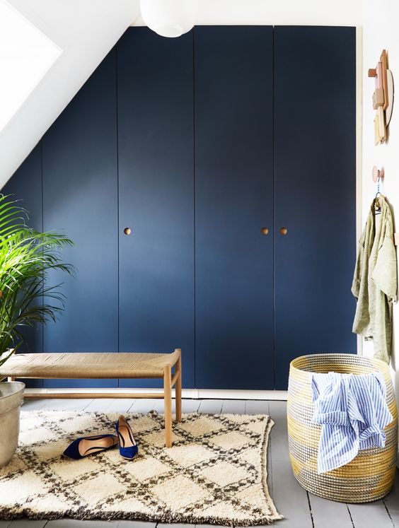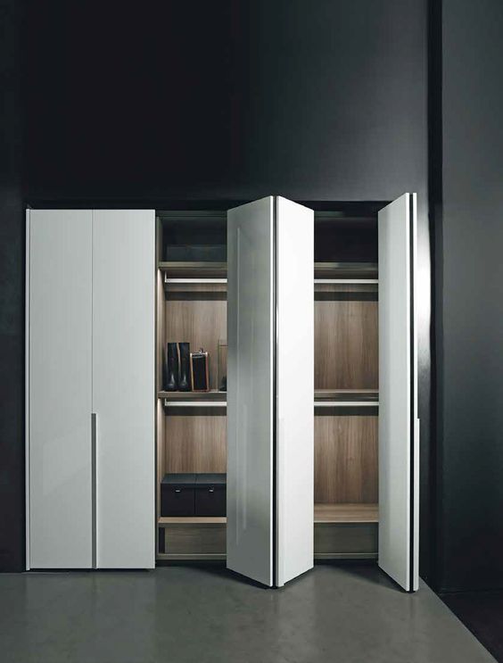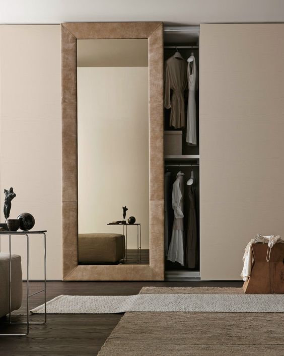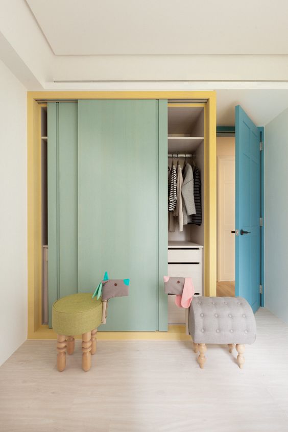 Alanınız yeterince büyük değilse dolap kapağı olarak sürgülü kapı kullanabilirsiniz. Böylece ortada kalan alana bir puf yerleştirebilirsiniz. Puf da giyinip soyunurken giysileri kısa süreli koyabileceğiniz bir aparat olarak kullanılabilir.